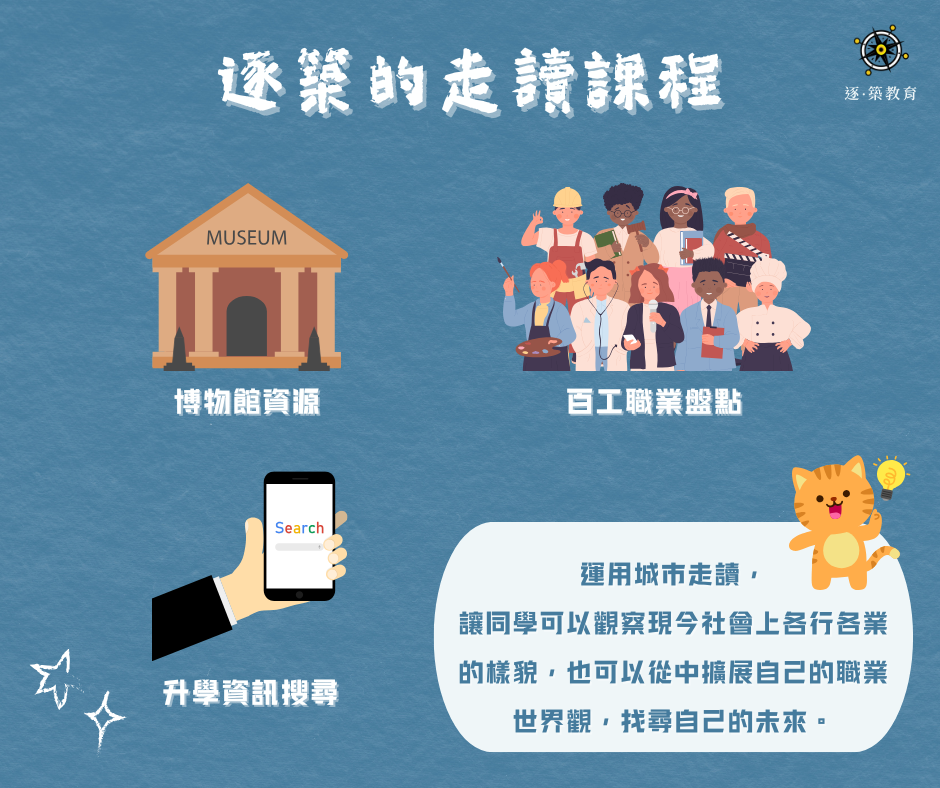 逐築期望在國中、高中的探索課程中,運用城市走讀,讓同學可以觀察現今社會上各行各業的樣貌,也可以從中擴展自己的職業世界觀,找尋自己的未來。