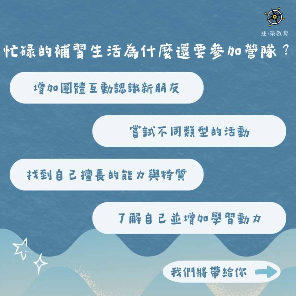 補習班的課程可以補課,但沒參加到營隊只能等待下個寒暑假才能有機會再次體驗,因此選擇參加營隊可能是值得的喔!另外,逐築提供的活動內容可能與學校的寒輔課程以及補習班的常態課程不同,我們期待成為你升學路上額外的養分,補足你對於升學知識的了解、個人特質的認識、審查資料的準備、學習旅程的規劃等,都能更上一層樓,一起追逐自我,建築夢想!